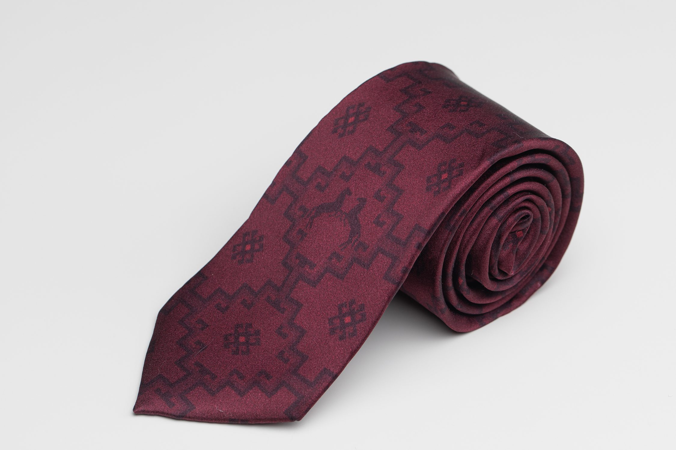 A premium 100% silk tie in a deep bordeaux red color, featuring an elegant geometric pattern. Its smooth texture and refined classic design make it a perfect accessory for business suits, formal occasions, and sophisticated everyday style.